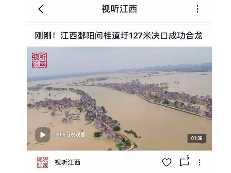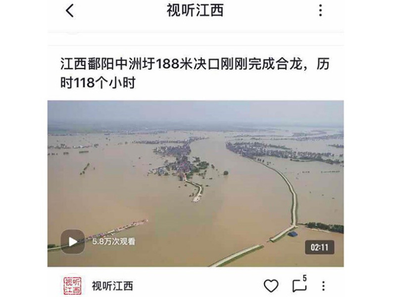 央視頻“視聽江西”報(bào)道:江西鄱陽(yáng)中洲圩188米決口剛剛完成合龍,歷時(shí)118個(gè)小時(shí)