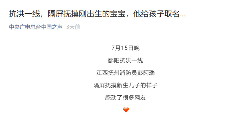 總臺(tái)中國(guó)之聲微信公眾號(hào)報(bào)道:抗洪一線,隔屏撫摸剛出生的寶寶,他給孩子取名…