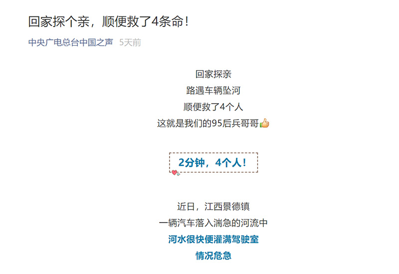 總臺(tái)中國(guó)之聲微信公眾號(hào)報(bào)道:回家探個(gè)親,順便救了四條命