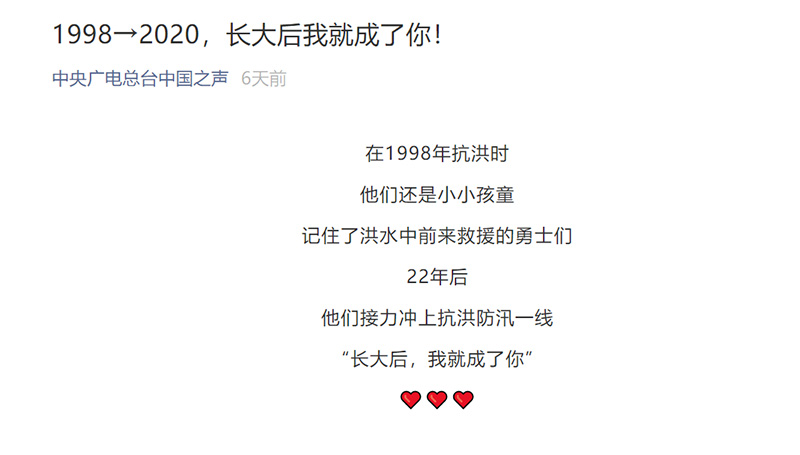 總臺(tái)中國(guó)之聲微信公眾號(hào)報(bào)道:1998-2020,長(zhǎng)大后我就成了你!