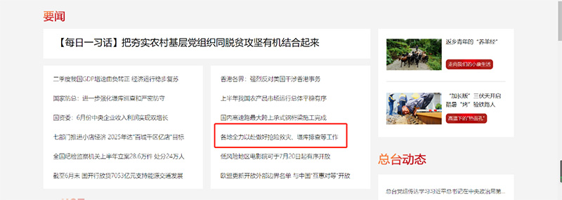 央廣網(wǎng)首頁(yè)要聞報(bào)道:各地全力以赴做好搶險(xiǎn)救災(zāi)、堤庫(kù)排查等工作