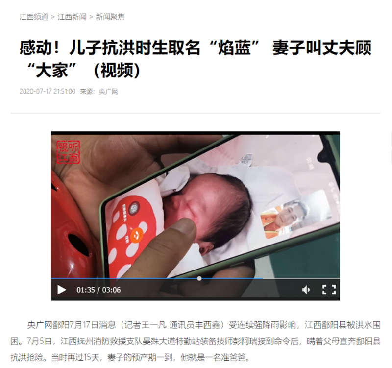 全媒體報(bào)道:感動(dòng)!兒子抗洪時(shí)生取名“焰藍(lán)”妻子叫丈夫顧“大家”