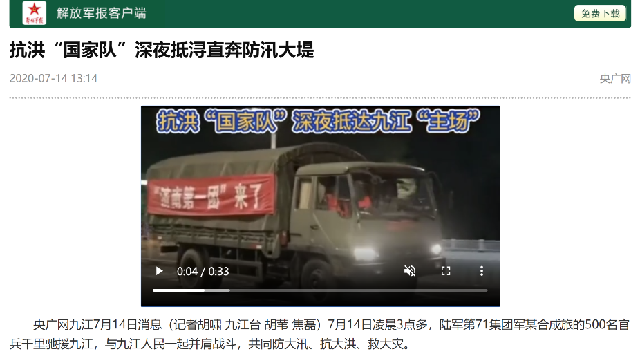 《解放軍報(bào)》轉(zhuǎn)載:抗洪“國(guó)家隊(duì)”深夜抵潯直奔防汛大堤