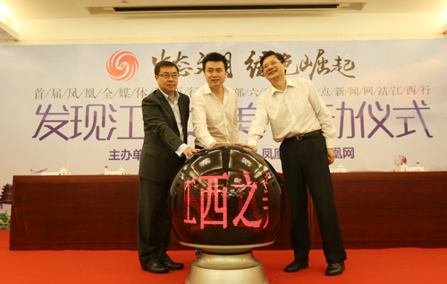 江西省委常委、省委宣傳部部長(zhǎng)姚亞平(右一),鳳凰網(wǎng)首席執(zhí)行官、鳳凰衛(wèi)視首席運(yùn)營(yíng)官劉爽(中),鳳凰新媒體副總裁兼鳳凰網(wǎng)總編輯鄒明為活動(dòng)啟動(dòng)。