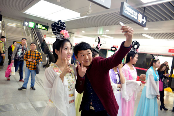 近日,南昌地鐵站驚現(xiàn)“七仙女下凡”,七位美女打扮成“仙女”的形象向過往的行人送花,并和車廂內(nèi)乘客互動(dòng)拍照,引發(fā)路人紛紛駐足觀看,不少人積極要求合影。