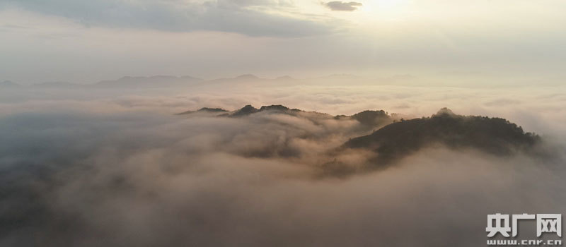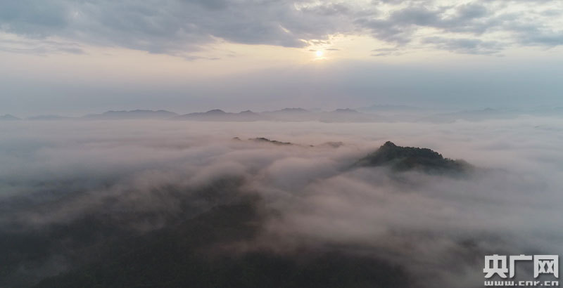 永新縣三灣國家森林公園日出云海,群山被卷上一層輕紗