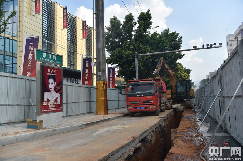 8月31日,在贛縣城區(qū)客家文化城周邊、贛新大道等地看到,道路兩側(cè)非機動車道已筑起綠色圍擋,中間一條深達3米的管溝被挖出,現(xiàn)場工人正在鋪設(shè)排水管道。當(dāng)天高溫天氣,工人鐘聲亮卻說,這種天氣是“難得”的施工日子。