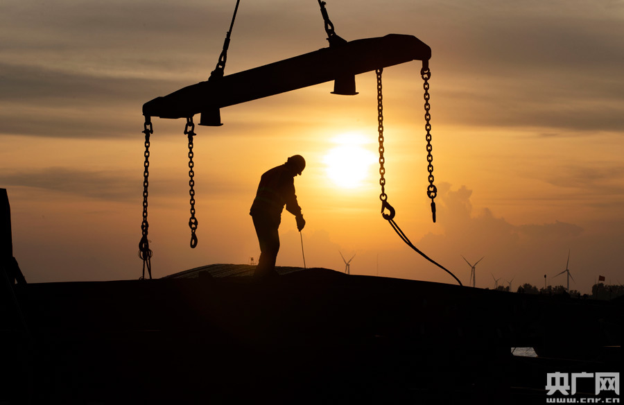 日落余暉,霞光萬丈,鐵臂揮舞,相得益彰。