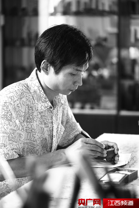 央廣網(wǎng)南昌1月10日消息(胡斐)張建華的工作室常年帶有墨香。兩側(cè)的墻壁上掛滿字畫、擺滿印章。
