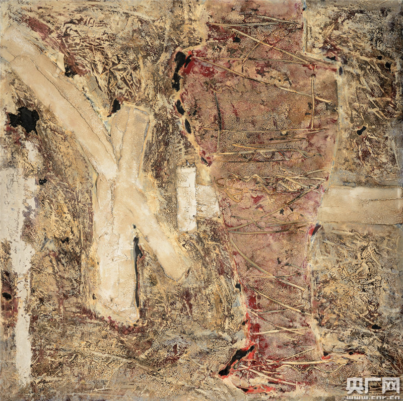 這一階段,他在作品中進(jìn)一步發(fā)掘了古老漆藝的語言魅力,畫面中厚重而斑駁的肌理和色塊,營造了關(guān)于文明碎片的記憶和永恒時間的氣息。而其獨特的紅魚符號仍然在其中遨游,象征了個體與時間存在,這使我們聯(lián)想起了海德格爾在其著作《存在與時間》中關(guān)于“此在”的概念。海德格爾認(rèn)為“此在”的存在是在敞開狀態(tài)下進(jìn)行的,它是由三個環(huán)節(jié)構(gòu)成的統(tǒng)一整體,這三個環(huán)節(jié)分別表示一種時態(tài),即將來、過去、現(xiàn)在。從這個角度理解,王向陽的紅魚正是一種“此在”的象征,既成為畫面的存在,似乎又是一個無處不在的此在者,我們可以理解為一種自由的象征和文化的共生,從而在其作品中表達(dá)了關(guān)于文明演化和個人體驗的復(fù)雜情感。