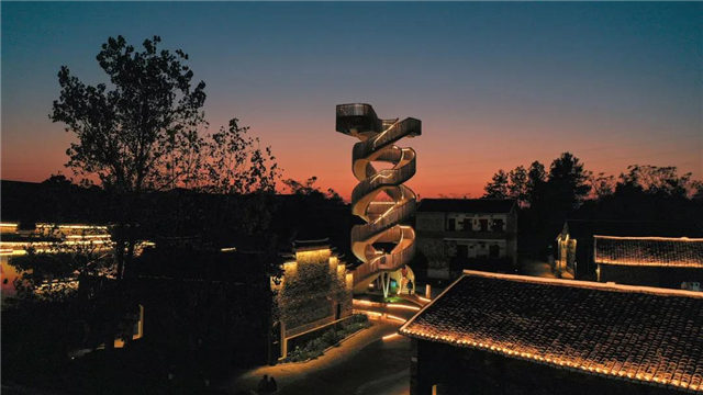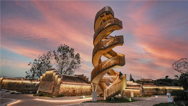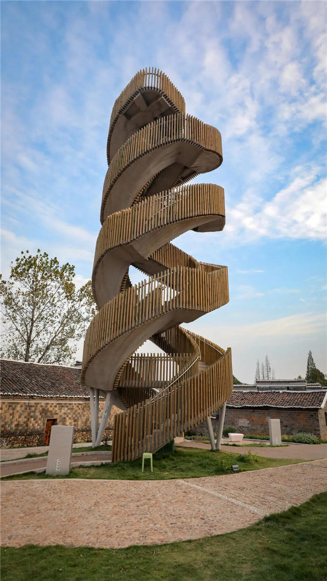 徘徊塔是村里的地標(biāo)建筑。它采用雙螺旋樓梯,雙入口設(shè)計(jì),總高17米。塔的造型,流動(dòng)不羈;登塔體驗(yàn),則要做好與塔一起在風(fēng)中搖擺的心理準(zhǔn)備。