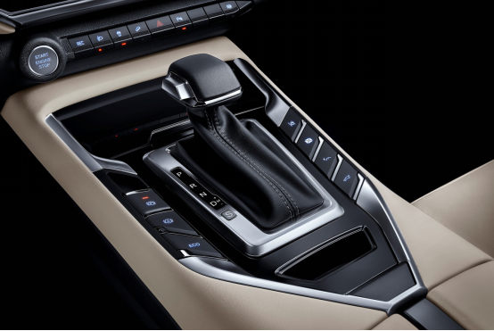 T500的檔桿設(shè)計很漂亮,像是飛機(jī)的推進(jìn)桿。檔桿旁邊是各種功能的按鍵,比如自動啟停、ECO模式、車道保持、全景影像、夜視系統(tǒng)、電動尾門等等左右兩邊依次排開,簡潔明了。