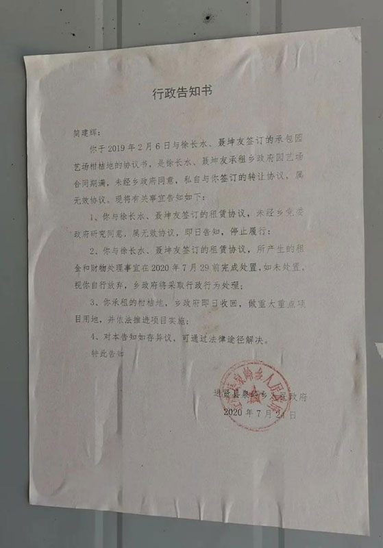 記者調(diào)查發(fā)現(xiàn),7月24日,泉嶺鄉(xiāng)政府下發(fā)了《行政告知書(shū)》,明確鄉(xiāng)政府與泉嶺鄉(xiāng)園藝場(chǎng)場(chǎng)長(zhǎng)徐長(zhǎng)水簽訂的《經(jīng)營(yíng)協(xié)議》于2018年12月30日到期,此后徐長(zhǎng)水與簡(jiǎn)建輝簽訂的《土地承包協(xié)議》應(yīng)屬無(wú)效。