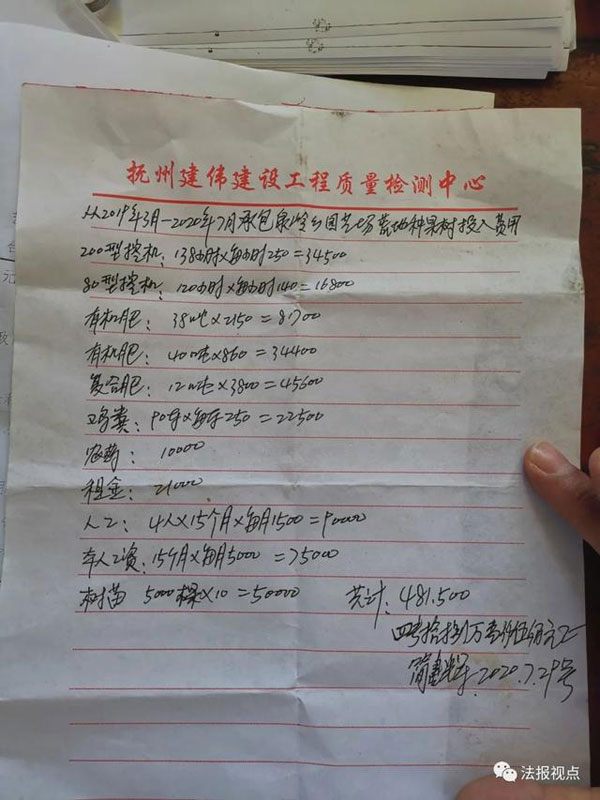 8月13日上午,進(jìn)賢縣泉嶺鄉(xiāng)園藝場(chǎng)上一片繁忙的施工景象,只見(jiàn)多輛推土機(jī)、挖掘機(jī)、后八輪正在平整土地?吹焦さ厣弦粋(gè)個(gè)連根拔起的樹(shù)兜樹(shù)根,簡(jiǎn)建輝愁眉蹙額,內(nèi)心五味雜陳。據(jù)他介紹,2019年2月6日,他與泉嶺鄉(xiāng)園藝場(chǎng)簽訂了《土地承包協(xié)議》,租賃了60余畝土地用于栽種柑桔,租金10496元/年,并預(yù)付了兩年2萬(wàn)余元租賃費(fèi)(租賃期限待鄉(xiāng)政府確認(rèn)后再行確定)。