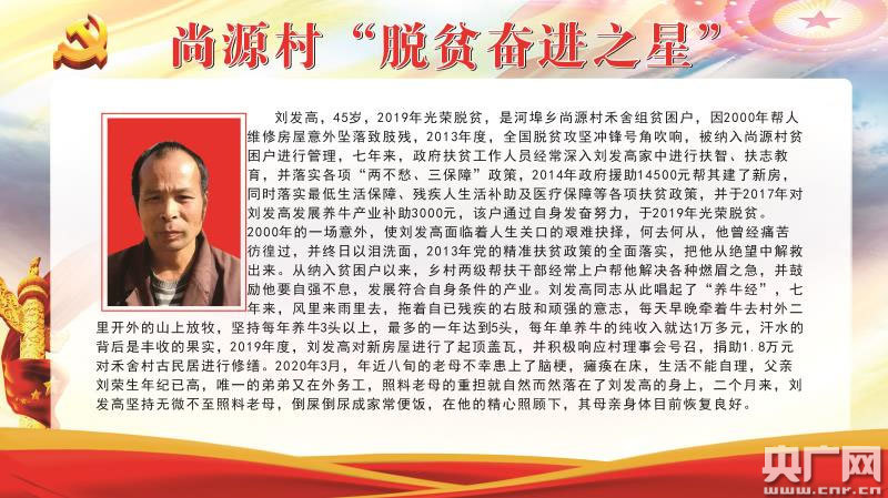 如今,在尚源村,劉發(fā)高身殘志堅,照顧生病的母親成為大家學習的榜樣。5月份,劉發(fā)高被評為河埠鄉(xiāng)脫貧奮進之星。