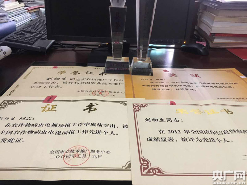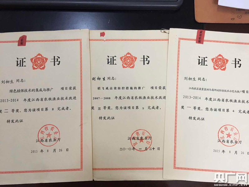 2005年6月是劉初生人生里的磨難之年,他被確認(rèn)患上了舌癌。當(dāng)年兒子正值高考,劉初生作為家中頂梁柱身罹絕癥幾乎要壓垮這個(gè)家。經(jīng)過成功的手術(shù)和放療化療,劉初生憑著樂觀的天性和頑強(qiáng)的意志,命運(yùn)眷顧他讓他從死亡線上掙脫開來。半年后稍一康復(fù),他沒向組織提出換個(gè)輕松崗位調(diào)養(yǎng)身子,照顧家庭,而是更加珍惜生命的第二春,全身心地投入植保植檢工作中,讓生命綻放芳華。劉初生與人合作完成的“稻飛虱高效防控措施的推廣”“江西農(nóng)區(qū)鼠害監(jiān)測與毒餌站防控技術(shù)示范與推廣”“綠色植保技術(shù)的集成與推廣”等項(xiàng)目分別榮獲江西省農(nóng)牧漁業(yè)技術(shù)改進(jìn)獎。2013年12月,國家農(nóng)業(yè)部授予他2011—2013年度全國農(nóng)牧漁業(yè)科技貢獻(xiàn)獎。他收獲了縣級以上榮譽(yù)30余項(xiàng),僅全國性農(nóng)業(yè)技術(shù)推廣先進(jìn)個(gè)人榮譽(yù)就有5次。正是憑著一連串的令人信服的佳績,他這個(gè)只有中專文憑的基層農(nóng)業(yè)技術(shù)人員,一路綠燈破格晉升為農(nóng)業(yè)技術(shù)推廣研究員。2014年,劉初生爭取上級農(nóng)業(yè)部門支持300余萬元,建設(shè)都昌縣植保植檢區(qū)域站大樓和都昌縣農(nóng)業(yè)有害生物預(yù)警與控制區(qū)域站觀測場。劉初生為了用好這筆?罡纳浦脖;A(chǔ)設(shè)施,他不辭辛苦,精打細(xì)算,比自家建房子還要用心十分。觀測場建成后,他每天都要抽出半天到觀測間工作,記錄原始數(shù)據(jù),發(fā)布準(zhǔn)確信息,雙休日也不例外。2015年“七一”期間,江西植保植檢系統(tǒng)在全省開展“實(shí)干興贛當(dāng)先鋒,植保系統(tǒng)在行動”主題巡回宣講報(bào)告會,劉初生是全省三名報(bào)告團(tuán)成員之一,他的先進(jìn)事跡傳遍贛鄱大地。