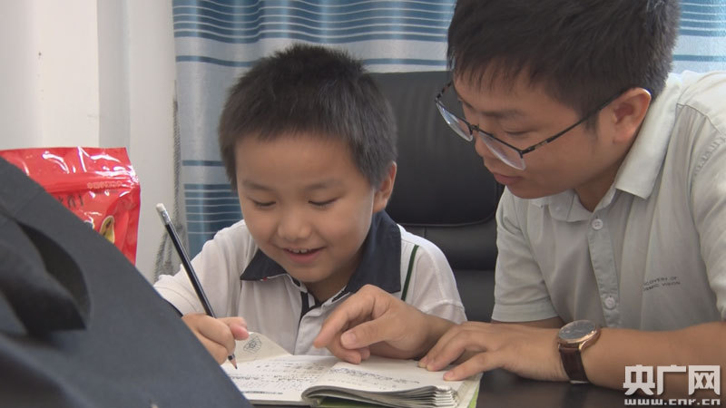 黃萬舜正在教小孩寫作業(yè)(央廣網(wǎng)發(fā) 通訊員鄧冬攝)