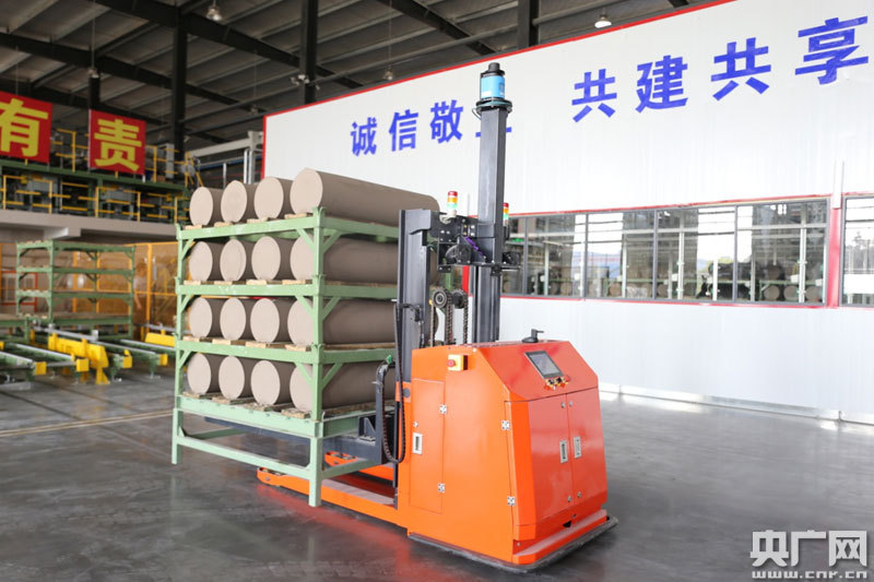 中鐵國(guó)材絕緣材料有限公司無人駕駛設(shè)備AGV自動(dòng)導(dǎo)航車正在轉(zhuǎn)運(yùn)泥段坯料