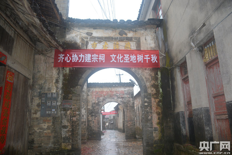 縣融媒體中心采訪團(tuán)一行首先來到臧灣鄉(xiāng)臧灣街古市牌坊前,牌坊上掛上了“齊心協(xié)力建宗祠,文化圣地樹千秋”的橫幅,但是這個刻著“臧灣古市”的古老牌坊仍屹立不倒,而牌坊周邊的景致依舊和當(dāng)年電影中大致相同。據(jù)悉,臧灣在古代本就是一個大集市,而在電影《閃閃的紅星》中,這里是潘冬子做工的地方。潘冬子以做工為名,為紅軍打探敵人的消息,最后砍死了胡漢三。于是,從影片中也隨之流傳出了一句經(jīng)典臺詞:“有米不賣”。一位老人指著街邊一棟三層樓房介紹道,這就是當(dāng)年的米鋪。雖然村民在街邊建起了一幢幢新房,但有些地方的墻壁上依然隱約可以看到“中國共產(chǎn)黨萬歲”等紅色標(biāo)語。