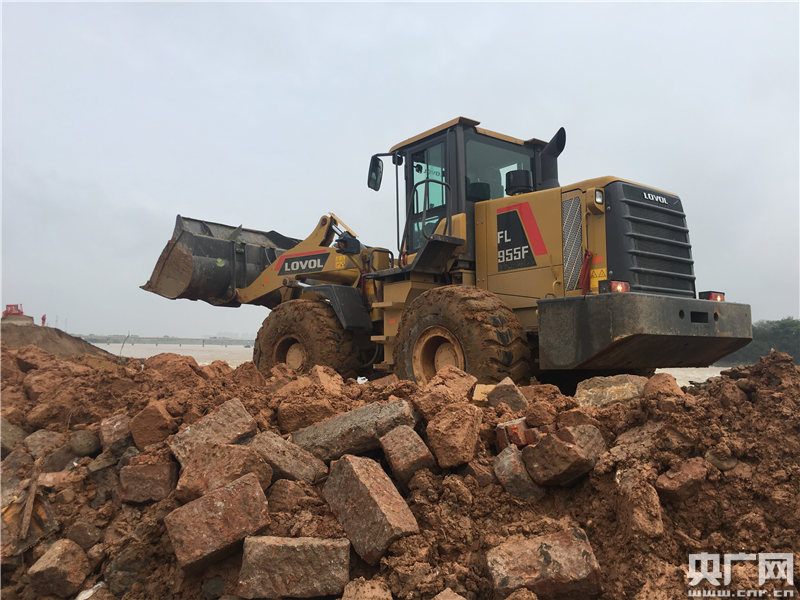 大型工程車輛在白塔河圩堤崩塌現(xiàn)場抓緊搶險施工
