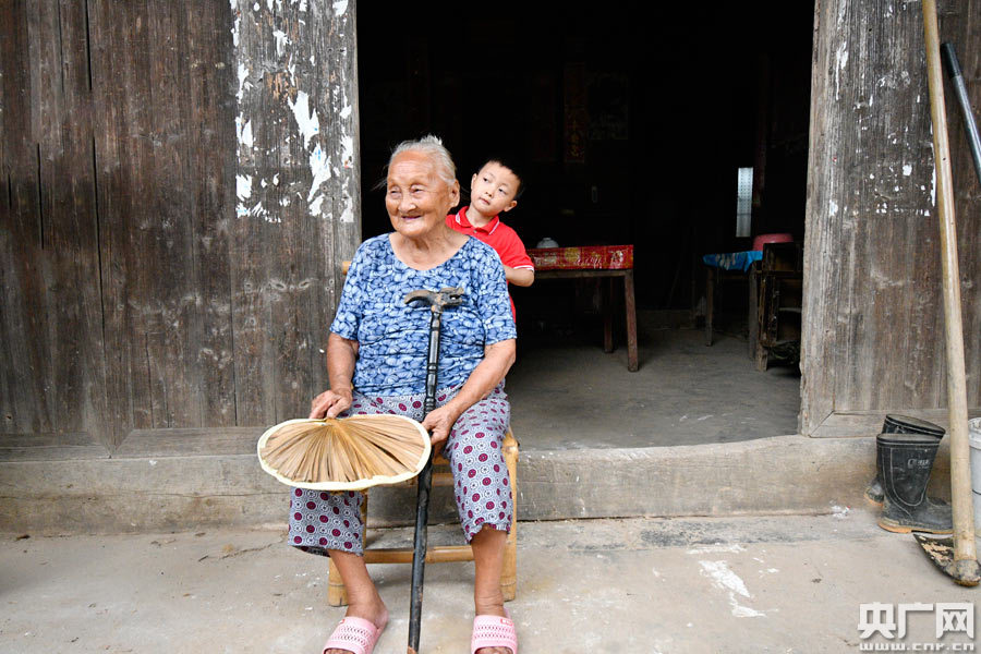 2019年8月29日,江西省撫州市金溪縣對(duì)橋鎮(zhèn)旸田村百歲老人與玄孫在保存完好的古民居前納涼。(鄧興東 攝)