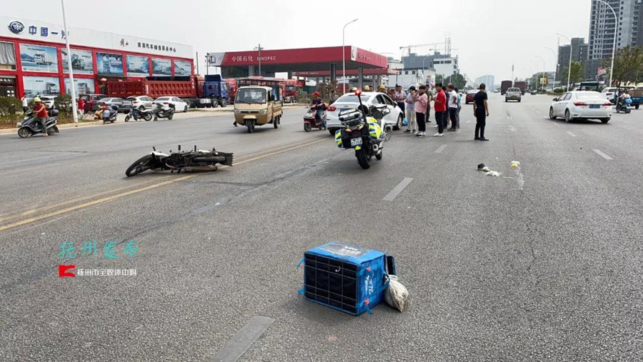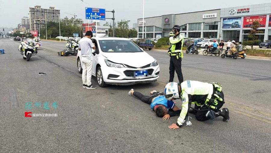 據(jù)撫州市公安局交警支隊直屬鐵騎隊交警介紹,7日中午12時10分左右,鐵騎隊員孫樂等人巡邏執(zhí)勤途經(jīng)貿(mào)易廣場十字路口往南200米處時,看到一輛白色的雪佛蘭汽車停在道路中央,而且不斷有路人往道路中央奔跑。鐵騎隊員立即上前了解情況,原來這里剛剛發(fā)生了一起交通事故,雪佛蘭汽車與一外賣小哥的摩托車發(fā)生了碰撞,外賣小哥被汽車卷入車底,整個身子被死死地壓在了汽車底下。