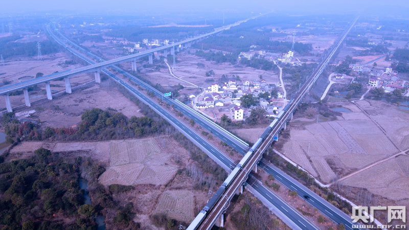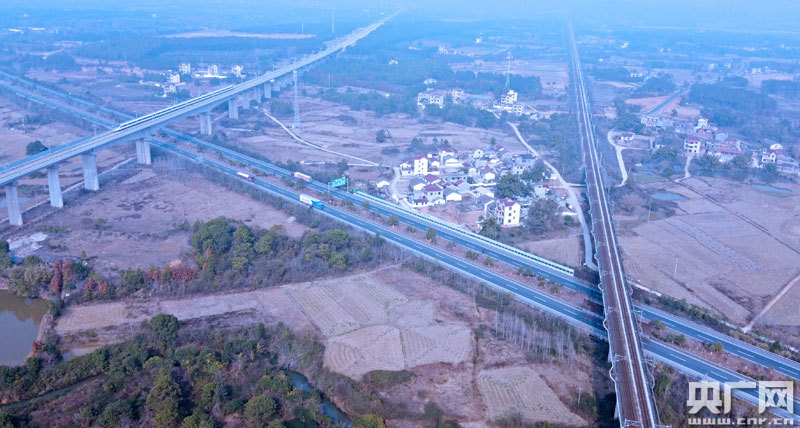 圖為2020年1月5日,無人機(jī)俯瞰江西省吉安市泰和縣城郊,剛剛開通的昌贛高鐵與京九鐵路、泉南高速并駕齊驅(qū)、縱橫交錯(cuò),構(gòu)建起一張便捷高效的立體交通網(wǎng)。
