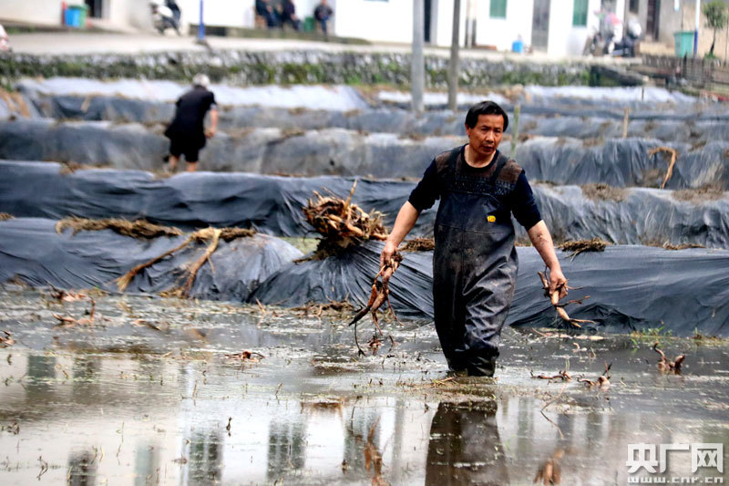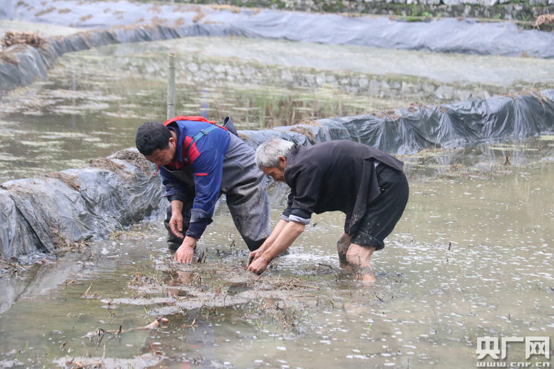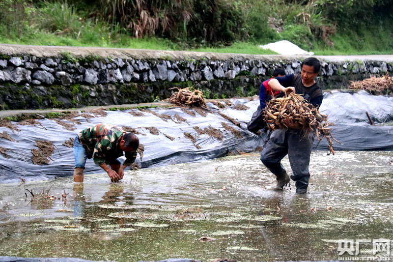 鄉(xiāng)廚陳敬來和村民在田里種藕