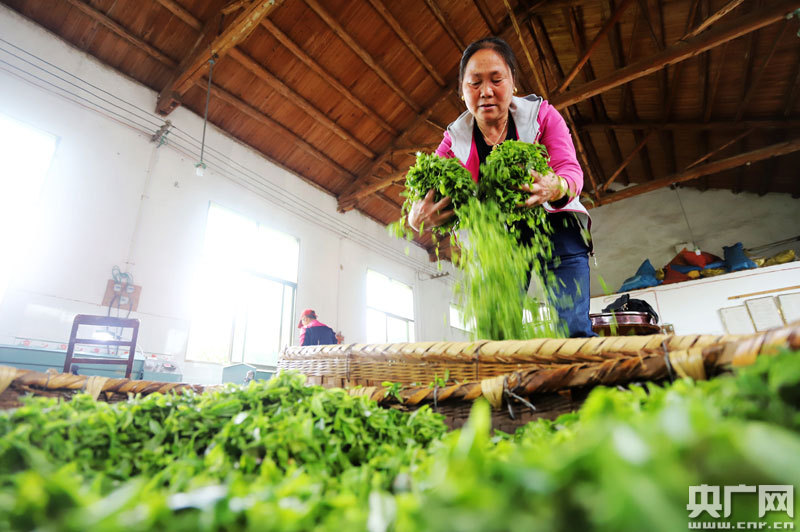 央廣網(wǎng)安福3月30日消息(記者王一凡 通訊員劉麗強)一點新綠,一縷茶香。清明前夕,安?h洋溪鎮(zhèn)塘里村的千畝茶園正洋溢著盎然生機,此時,茶葉已抽出鮮嫩的芽尖綠苞,茶葉進入采摘期,茶農(nóng)們搶抓農(nóng)時,采摘“明前茶”,茶園里躍動著村民們忙碌的身影。而在茶園旁邊的制茶車間,十多名茶農(nóng)正緊張地作新茶,隨著茶機不斷的轉(zhuǎn)動,車間里散出陣陣撲鼻清香。