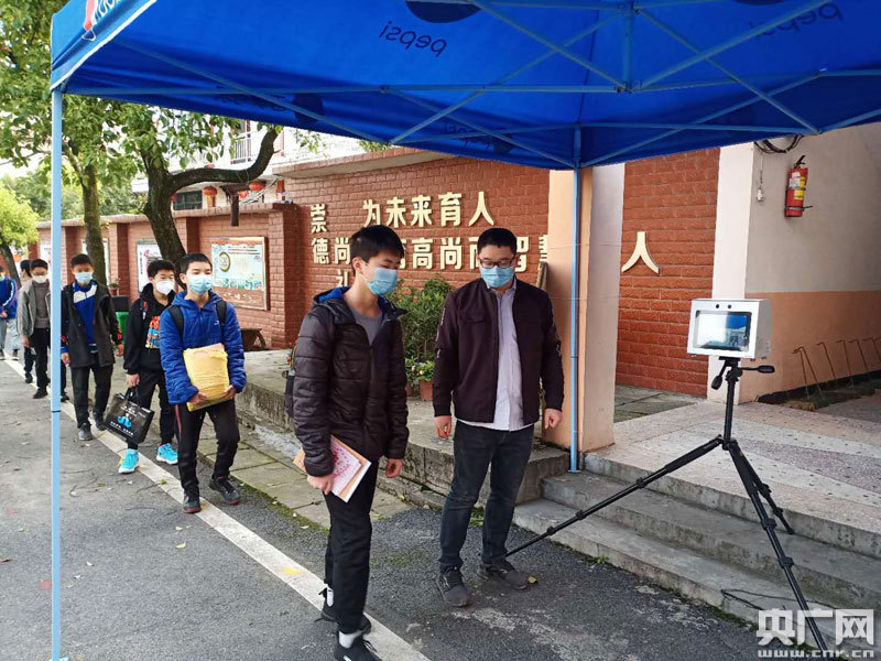 早上七點鐘,為避免人群聚集,校門口設(shè)立迂回通道,地上清晰地標(biāo)注間隔一米排隊等候線。交警和學(xué)校老師等人員都在現(xiàn)場維持秩序,學(xué)校保安們則忙著給學(xué)生們測體溫。