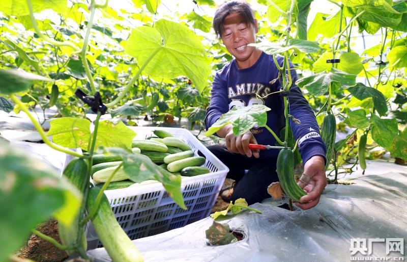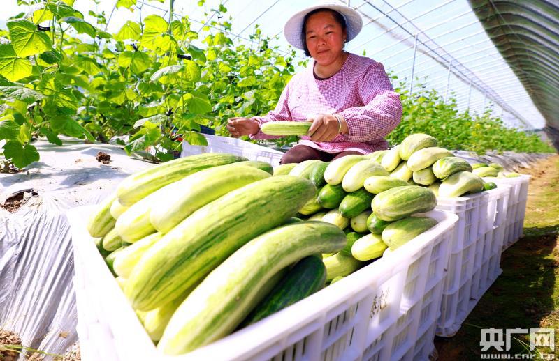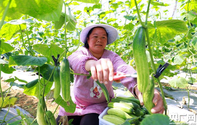 4月9日,江西省吉安市泰和縣上模鄉(xiāng)老居村產(chǎn)業(yè)扶貧基地黃瓜喜獲豐收,農(nóng)民在大棚里采摘黃瓜