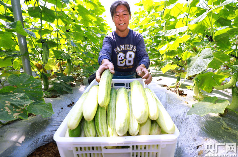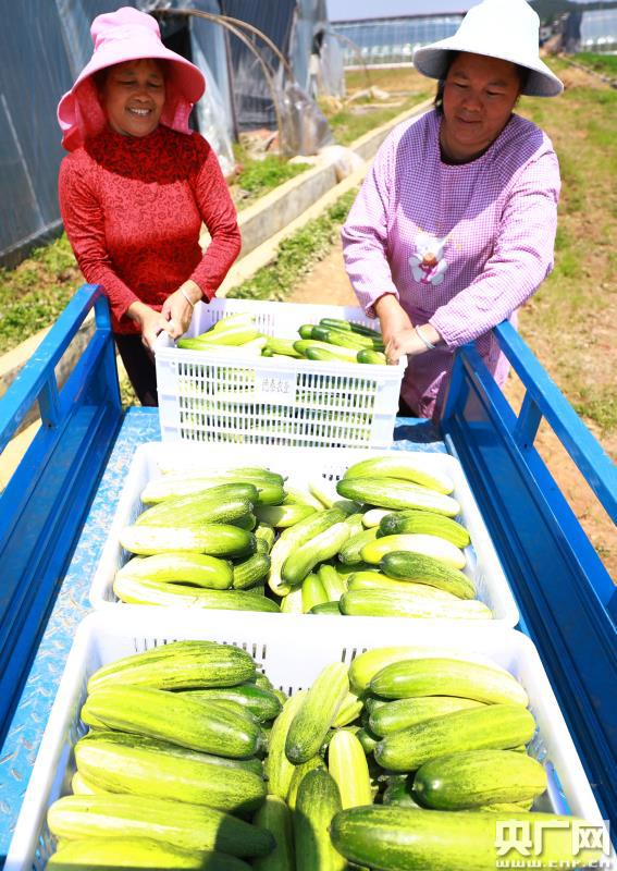 4月9日,江西省吉安市泰和縣上模鄉(xiāng)老居村產(chǎn)業(yè)扶貧基地黃瓜喜獲豐收,農(nóng)民將采摘的黃瓜裝入筐中