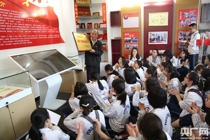 在“夕陽紅榮譽(yù)室”與參觀學(xué)生交流分享