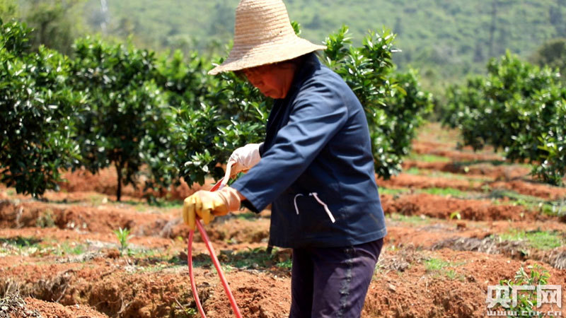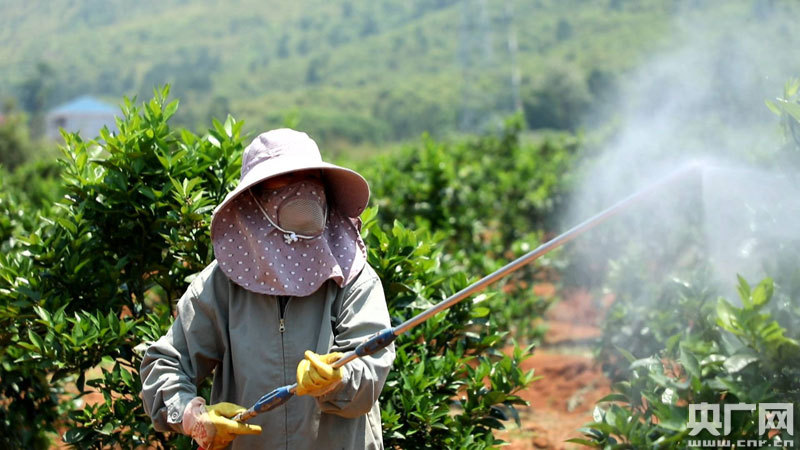 “下班回家吃飯了”遠(yuǎn)處的村民在呼喊著,正在為臍橙樹噴灑著藥水的左四英也顧不上,堅(jiān)持把最后一壟果樹噴灑完藥水才肯離去,這樣的工作,年近6旬的左四英已經(jīng)在這里整整干了三年。