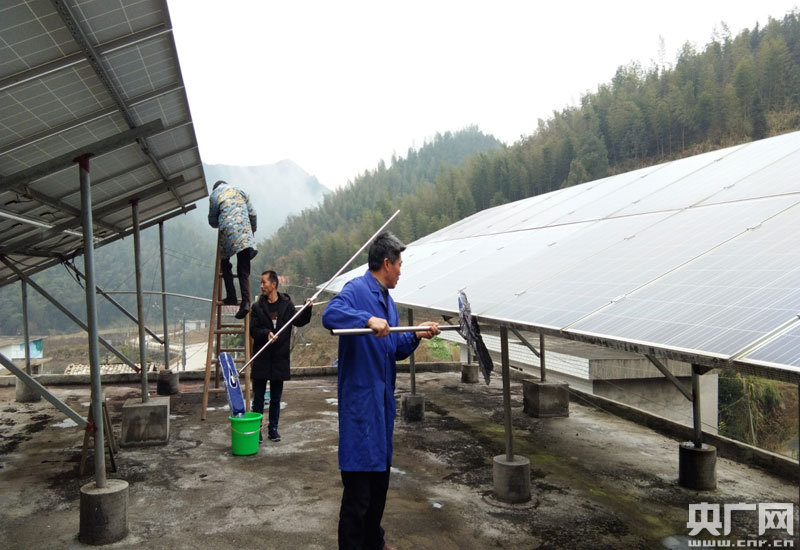 水山村貧困戶汪根敏、張雪萍、唐新明正在清洗光伏電站