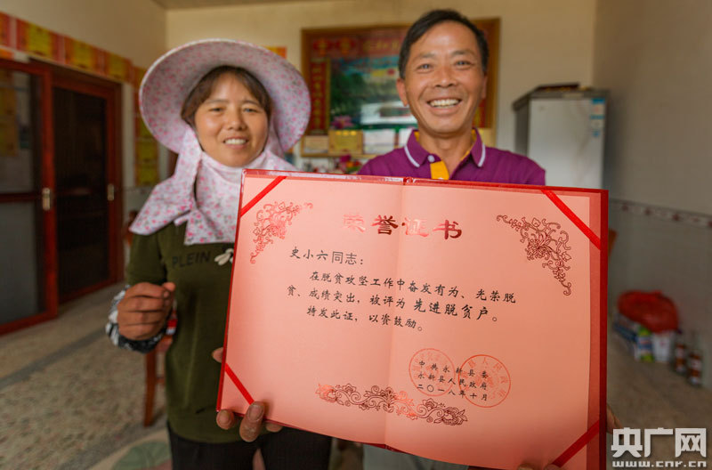 史小六展示縣里頒發(fā)的“先進(jìn)脫貧戶”證書