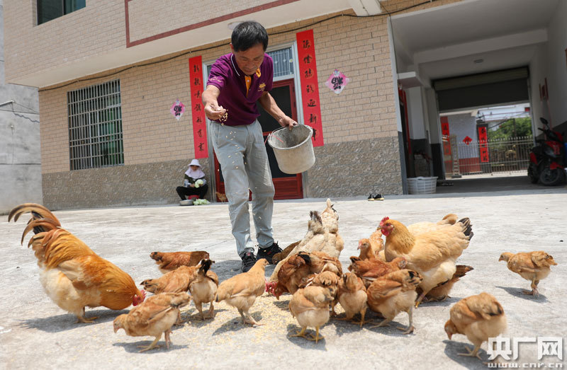 史小六在自家新建的房子前給雞喂食