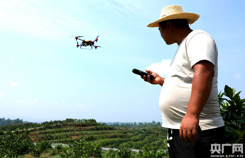 井岡蜜柚基地,技術(shù)人員正在操縱無(wú)人機(jī)噴灑作業(yè)(央廣網(wǎng)發(fā) 通訊員朱國(guó)朝 攝)
