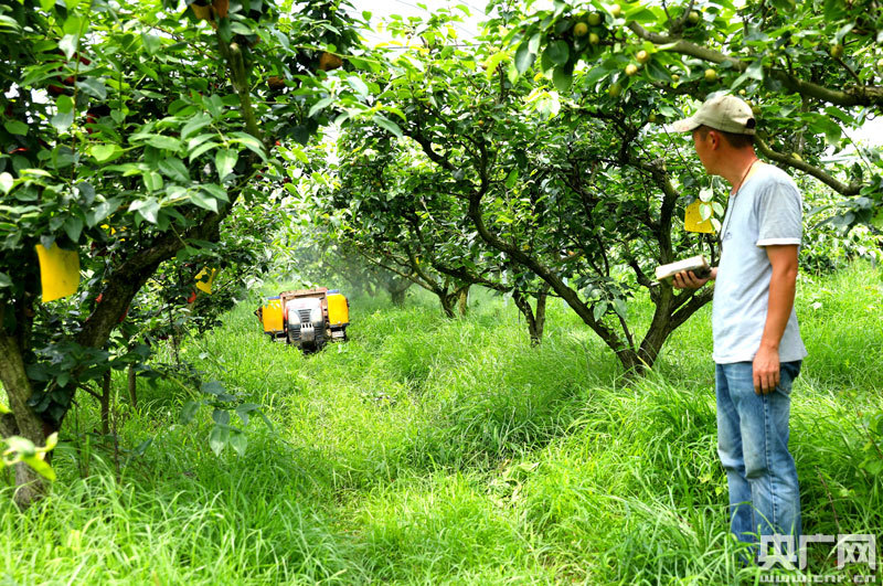 翠冠梨基地,技術(shù)人員正在操縱無(wú)人車(chē)噴灑作業(yè)(央廣網(wǎng)發(fā) 通訊員朱國(guó)朝 攝)