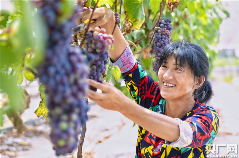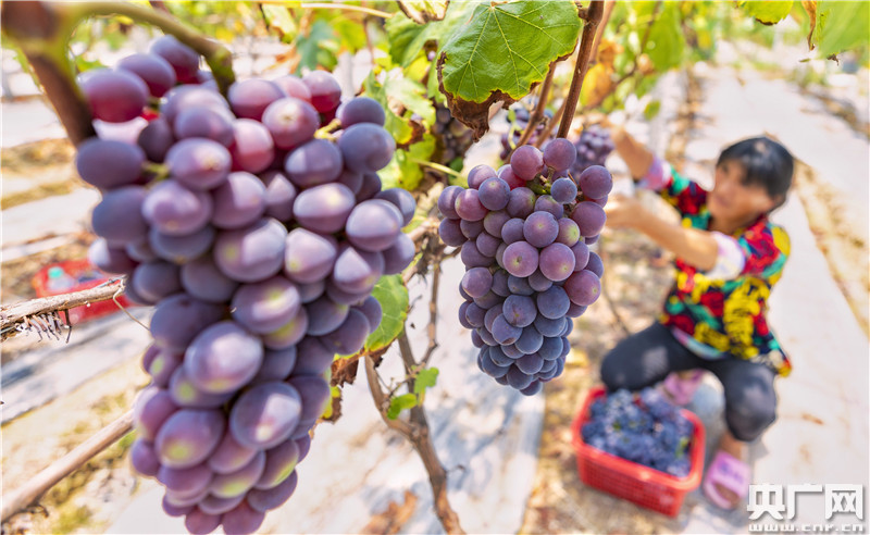 2020年6月15日,江西省吉安市泰和縣苑前鎮(zhèn)巷口村的生態(tài)葡萄園喜獲豐收,果農(nóng)正開心采摘紫色葡萄。