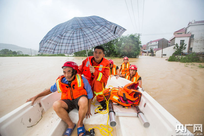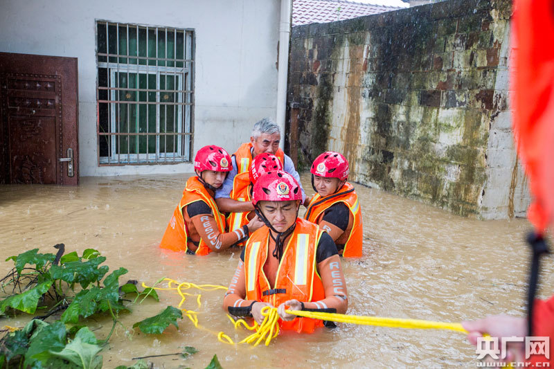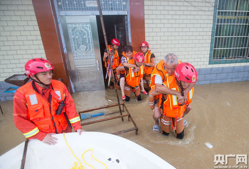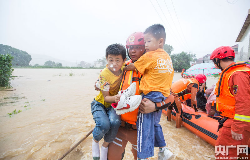 7月8日,消防救援人員在江西省都昌縣鳴山鄉(xiāng)石峰村轉(zhuǎn)移被洪水圍困的群眾(央廣網(wǎng)發(fā) 通訊員傅建斌 攝)