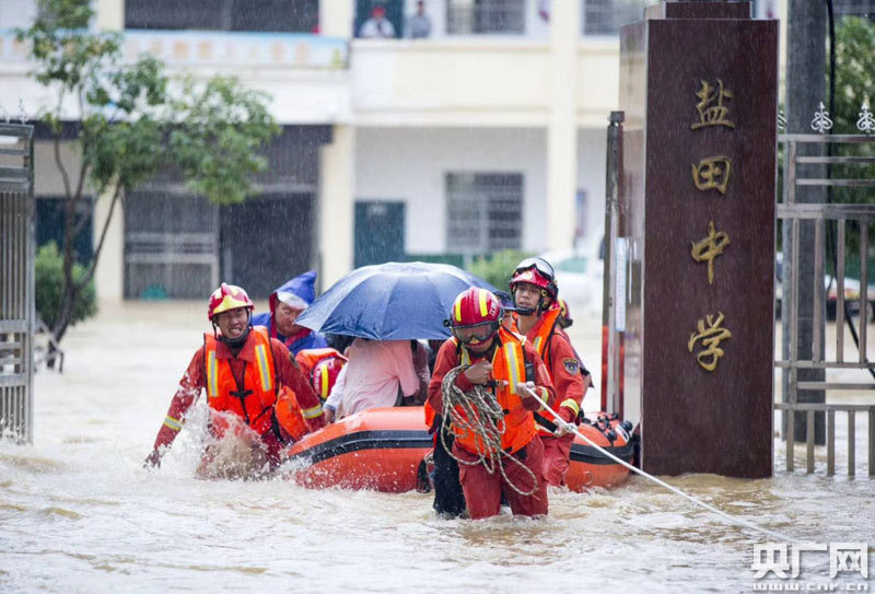 7月8日,特大暴雨引發(fā)山洪,大港、鳴山等鄉(xiāng)鎮(zhèn)受災(zāi)嚴(yán)重。武警官兵、消防大隊(duì)、藍(lán)天救援隊(duì)、鄉(xiāng)村干部等隊(duì)伍迅速出動(dòng)救援。地勢(shì)低洼的鹽田中學(xué),當(dāng)日早晨房屋浸水超1米。救援人員利用橡皮艇,鏟車等,經(jīng)過(guò)5個(gè)小時(shí)的緊張施救,安全轉(zhuǎn)移學(xué)生441人、老師30人。7月9日雨勢(shì)暫歇,部分因山洪“過(guò)水”后的房屋、鄉(xiāng)道村巷逐漸顯露,環(huán)衛(wèi)、防疫、供電等部門組織人員開展清掃、消毒、搶修,鄉(xiāng)村干部群眾和志愿者及時(shí)清理淤泥、清除雜物!吧胶閬(lái)得快,退得也快,退到哪里,正常生活秩序就恢復(fù)到哪里!眳⑴c救災(zāi)的鄉(xiāng)村干部說(shuō)。