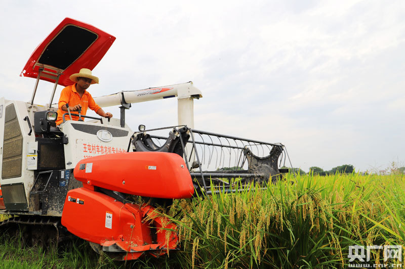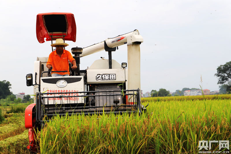 王屯村“扶貧農(nóng)機(jī)”在收割早稻(央廣網(wǎng)發(fā) 通訊員劉麗強(qiáng) 攝)