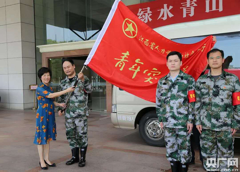 青年突擊隊出征儀式,江西省人社廳廳長劉三秋給隊員授旗