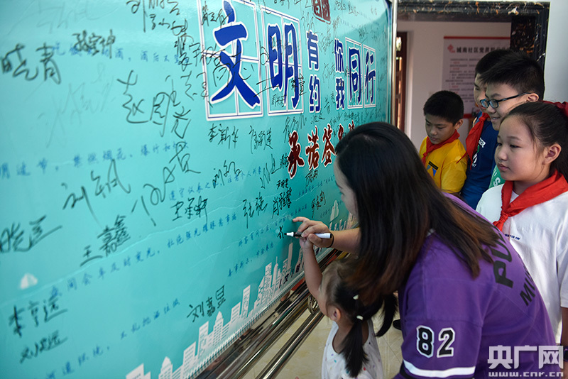 家長帶孩子在文明展板上簽名,一起相約文明從我做起(央廣網(wǎng)發(fā) 通訊員 攝)
