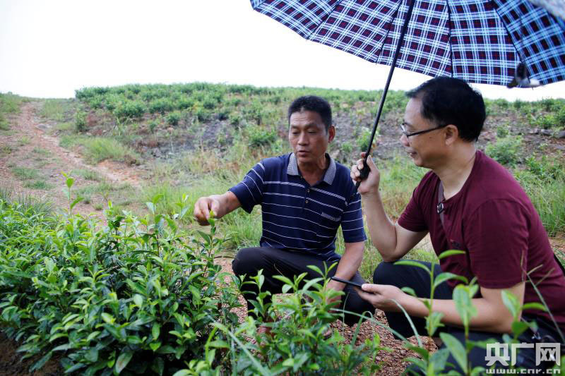 沙仁榮(左)正向鄉(xiāng)干部講解白茶種植技術(shù)(央廣網(wǎng)發(fā) 通訊員供圖)