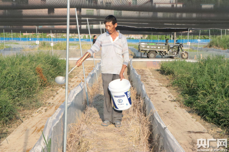 為貧困戶正在喂食青蛙(央廣網(wǎng)發(fā) 通訊員供圖)