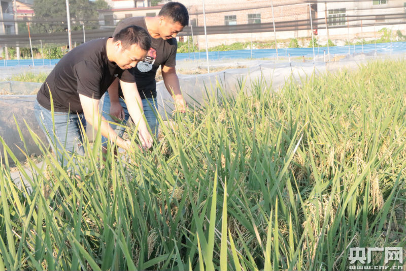 櫸溪村第一書記胡松和合作社負(fù)責(zé)人蔣曬平正在稻田了解長(zhǎng)勢(shì)(央廣網(wǎng)發(fā) 通訊員供圖)