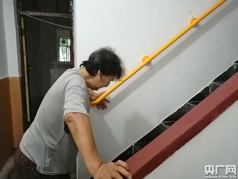 鄧福蓮在樓梯間通過過通扶手上樓(央廣網(wǎng)發(fā) 通訊員汪有輝 攝)