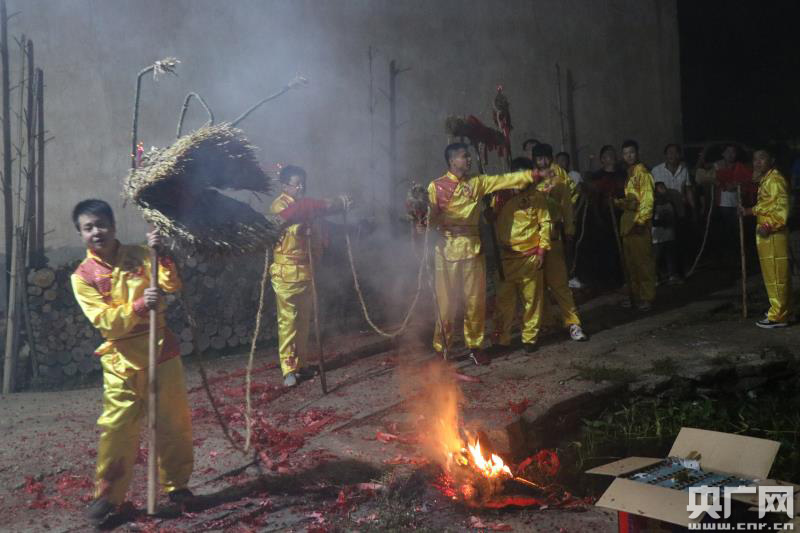 10月1日的下午,記者來到該村,當?shù)卮迕裾谟玫静莺妥厝~扎出1個龍頭、10個龍身和1個龍尾,總共12節(jié),寓意一年12月,月月平安,月月風(fēng)調(diào)雨順。晚上7時許,舞龍燈正式開始,霎時間鑼鼓聲、鞭炮聲、禮花聲齊鳴,不絕于耳,整個山村沉浸在歡樂的海洋中。10多名青壯年頭上扎著彩巾、身穿鮮艷的服裝在村宗祠門口廣場上舞起來。在禮花的映照下,稻草龍燈時而上下翻滾、時而空中盤旋,從村宗祠沿著村道翻滾前進,來到各家各戶門前廣場,家家戶戶燃放鞭炮、禮花迎接。歡慶的鑼鼓聲和鞭炮聲響徹山村夜空。